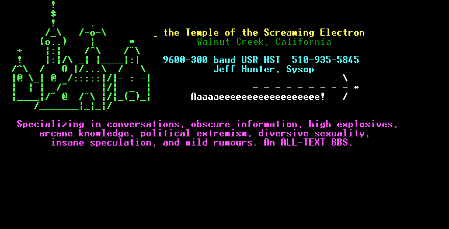 Before the internet became widely available at around 1994, many computer users were already sharing files, messaging each other, and sharing ideas. BBSs allowed people to connect like never before. Not every BBS was peachy clean, though; some BBSs were a bit edgier and dealt with controversial topics. One such BBS is TOTSE, short for The Temple of The Screaming Electron, a BBS located in the San Francisco Bay area. TOTSE was part of a bigger BBS network called NIRVANAnet, which included interestingly named BBSs such as “My Dog Bit Jesus” and “Burn This Flag”. It may be no surprise that these BBSs are centralized to the Bay Area, the Berkeley Free Speech Movement’s birthplace, no doubt ready to offend and discuss edgy topics that would make any parent faint.