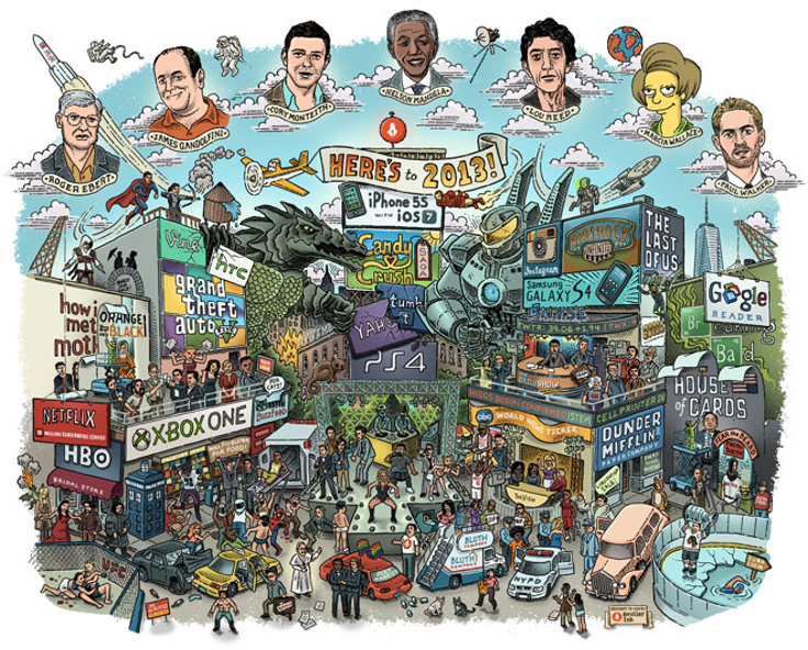 There are other stylistic changes to the site in 2013 versus 1996: the date has been removed and the color pallet has been simplified (red, green and yellow all mostly removed from the site design, with color primarily visible in the feature images for articles), which makes sense as the contrast between the black and white “background” and the feature images – which are often multicolored – invariably causes consumer attention to shift towards them, and the articles they link to. Of particular note in the 2013 edition is the “Everything That Happened in 2013 in One Image”, showing off a magnificent little world: a veritable cornucopia of an image now available after over a decade of technological evolution, weaving together aspects from civil rights, TV programs, technology, video games, streaming services, combat sports and more. This is exactly the kind of content that was simply unavailable in 1998. By way of contrast, the only meaningful image on the front page of the 1998 edition was an image of the Wired’s print version.