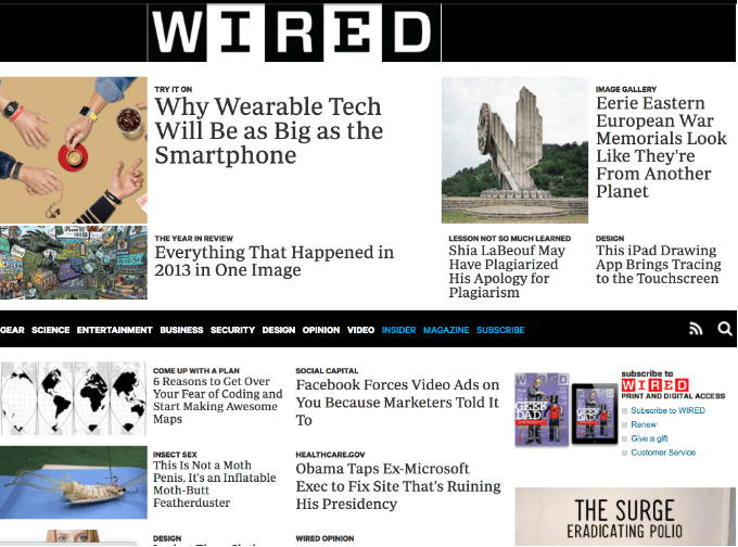 Wired is a print and digital magazine focused on how emerging technologies affect culture, the economy and politics; it often reflects the techno-utopian views of its founders. However, its focus has shifted slightly over time from being a broader tech news reporter to become more focused on pop-culture for the benefit of younger readers, who are generally the top target audience for the latest news on new consumer technologies. It has been in circulation since March 1993. Below we find an archived example of the online version of Wired from 6th December 1998 as the first image, and another from 18th December 2013 as the second: