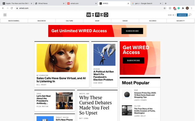 Finally, it is worth touching on the changes from previous iterations to today’s version (above). The standout feature is the significant re-introduction of the color red, with two ads pushing “Wired Access”, the site’s subscription-based service. This is a clear sign of how the shift to paywall-free, accessible news for everyone creates financial pressures on news organizations that didn’t exist when a majority of their readership bought the print version. Apart from that, the layout is even more minimalistic than in 2013, with the distinctive black and white logo colors no longer dominating the top of the page, making it a world away from the 1998 text-heavy version. The colors are still retained (indeed red is more prevalent now as it was in 1998) but they are utilized in a subtler fashion by to delineate each of the articles. In true 2020 style, politics is now front-and-center of the agenda, with no less than 4 articles directly related to the US political situation and/or popular movements – this is consistent with the wide-ranging but shifting areas of coverage Wired has shown throughout its various iterations, as it remains topical for the latest generation of tech-interested readers (who are inevitably on the younger side).