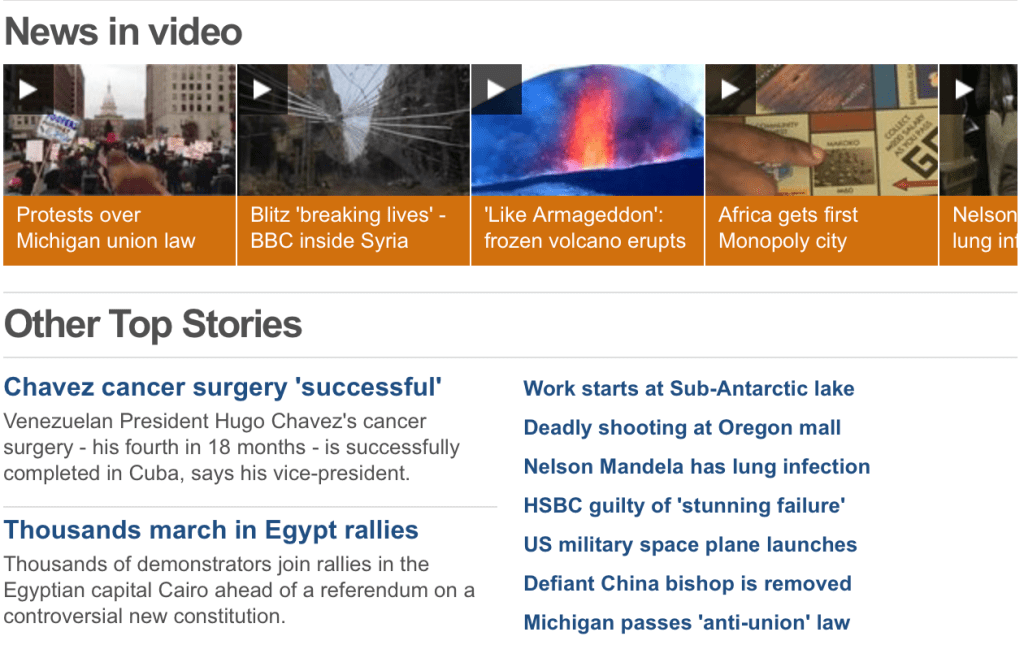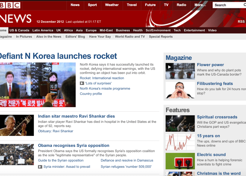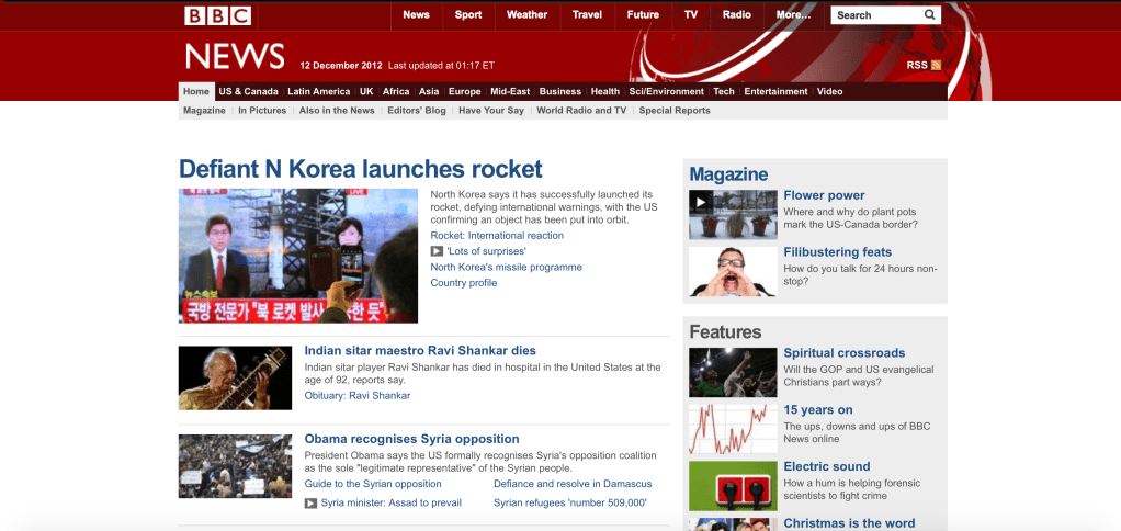 The picture above is a screenshot of the front page of BBC News Online on December 12, 2012 captured by WayBack Machine – exactly 14 years after the one mentioned above. The banner is completely different than the banner from the 1998 front page. What was once primarily a blue banner is now a red one with an image of a globe in various shades of grey, white, and red (instead of the red star). This blue to red change was officially made in 1999, when BBC made its first big website revamp. Starting with the addition of the globe image, the change in BBC News’s mission is clearly shown – to be worldwide news source, not just a UK new source.