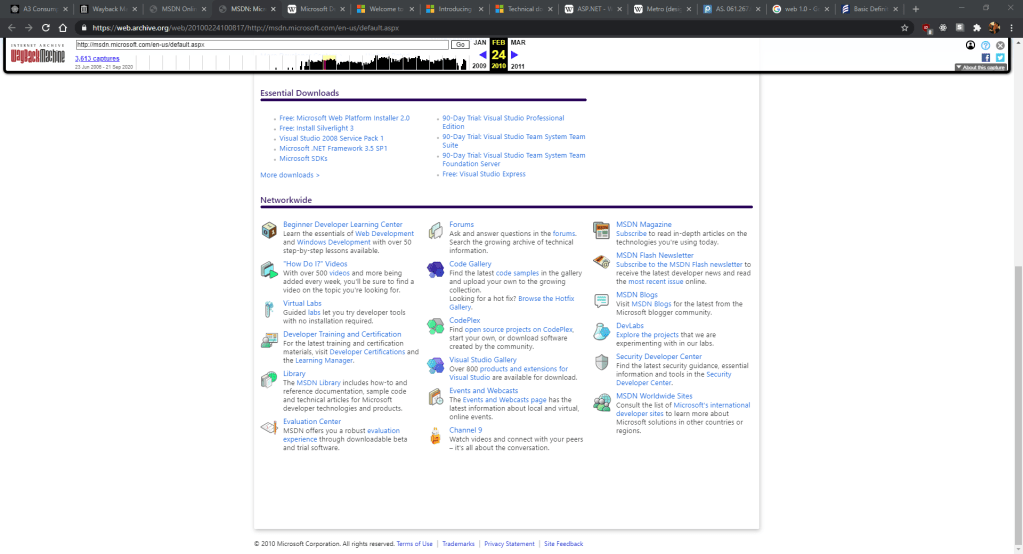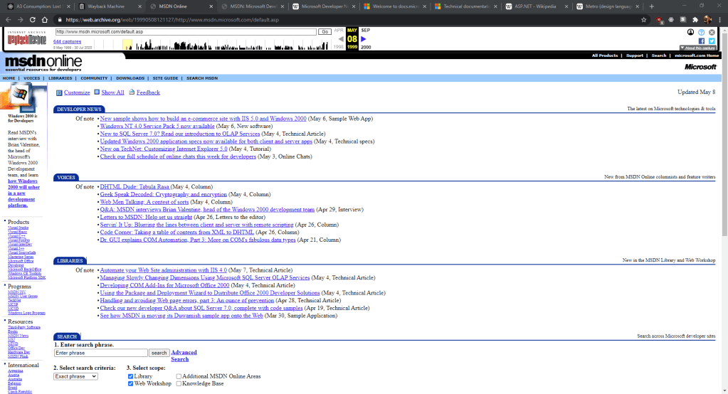 The Microsoft Developer Network (MSDN) is a website/portal for software and hardware developers. It launched in 1992 as a CD-ROM-based collection of technical documentation and articles, and at one point even offered subscriptions which provided licenses to much of Microsoft’s software. The website, MSDN Online, was launched in 1998 To examine some of the history of the service, we’re going to use the Wayback machine and look at some of the earliest snapshots of the website during the Web 1.0 era and see how it changed in the next generation of web technology around 2010.