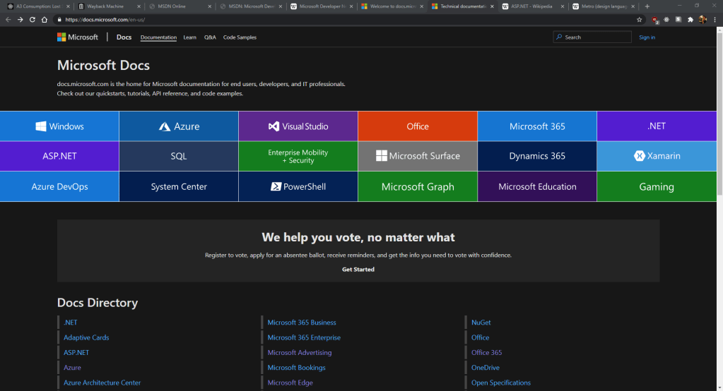 Successor to MSDN, Microsoft Docs took over in January 2020, is meticulously built with user-experience in mind, and features one of my favorite things as a developer: dark theme. The website prominently places its links to its different products in colored tiles reminiscent of their Windows Phone Metro design. Personally, I really liked the evolution of MSDN each step along the way all the way to the current site, which I think is the best. Standards of the web change over time, and each iteration of MSDN displays a more modern understanding of how users consume content at the time.