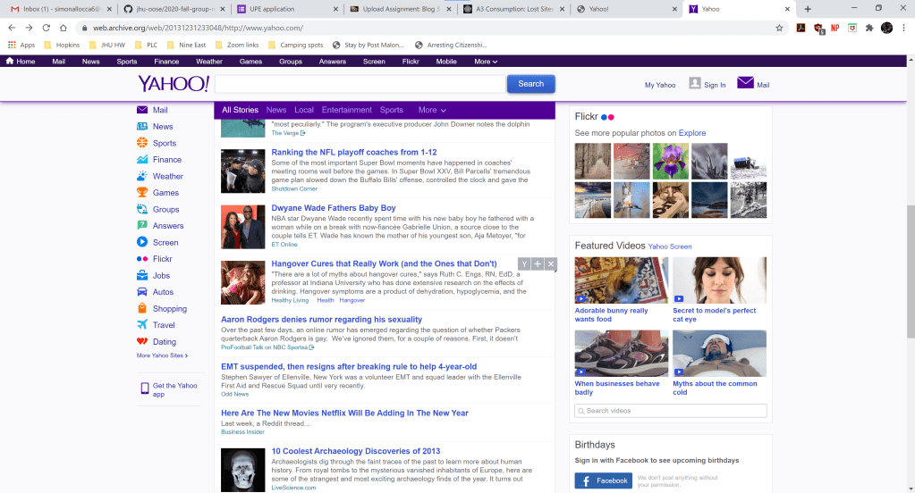 This Featured Videos section also appears on many other websites with titles that tempt clickbait. Clickbait is the practice of making the most enticing title for a video to get people to click on it, even if the video itself disappoints. This type of attention-grabbing is necessary because the people going on Yahoo are expecting instantly gratifying links and content, quickly surfing through easy-to-see videos and images with short attention spans. The design of the 1996 website would have only been useful for people with a specific target in mind.