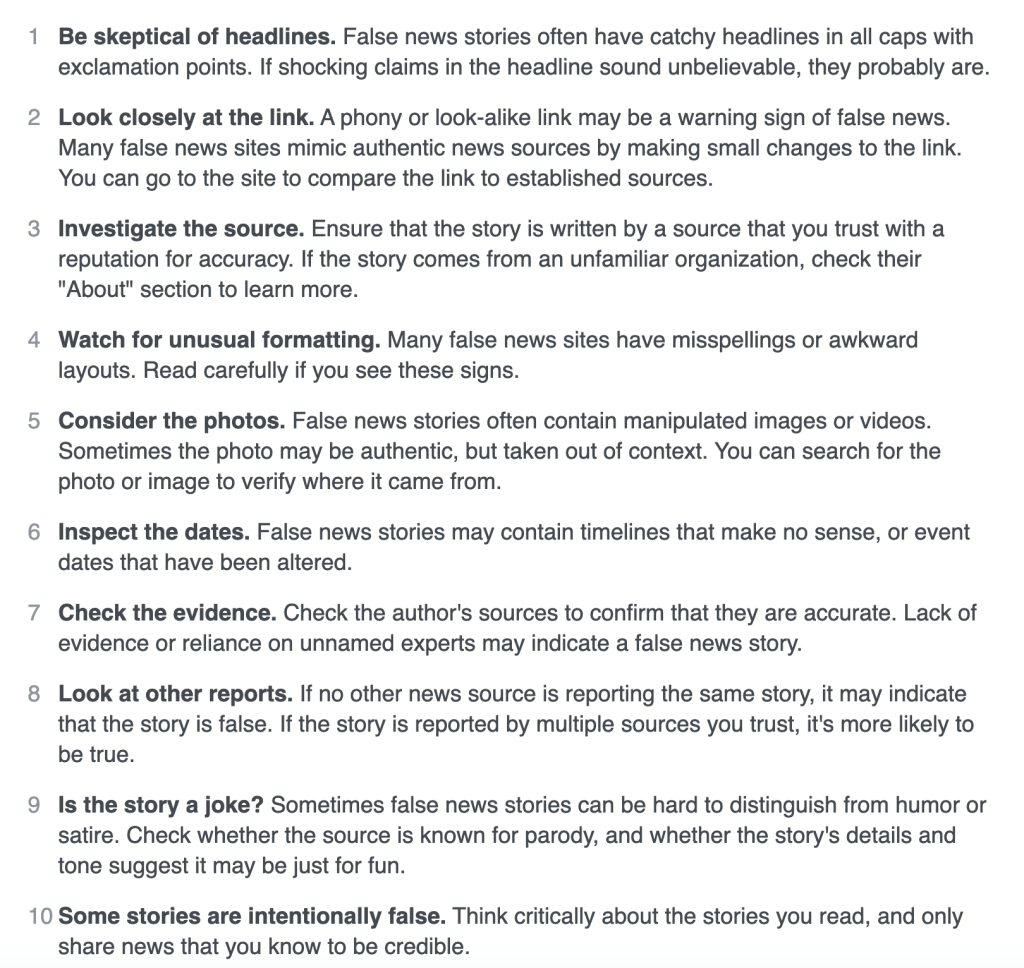 Facebook has recently created a page on its website titled “Tips to Spot False News”. This page shows how Facebook is trying to equip its users to identify and report fake news on the platform. It first explains what Facebook themselves are doing, such as “remove[ing] fake accounts and disrupt[ing] economic incentives for people that share misinformation.” It then lists 10 tips for users to determine for themselves what is fake: