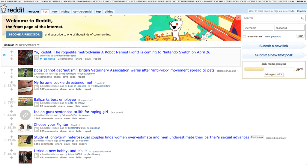 Reddit.com is a website home to 2.4 million different communities, called subreddits, each of which has its own theme, culture, and users, and all of which were user-created. Of these communities, over 130,000 are considered “active” (source), meaning they have posts uploaded to them on a semi-frequent basis. The content of subreddits ranges greatly: from all things related to Kanye West in r/Kanye, to resources on and discussion of weightlifting, cardio, and general exercise in r/Fitness. The wide diversity of communities offered on Reddit is baffling. Thousands of hobbies, languages, cities, political leanings, videogames, TV shows, and even pornographic models all have their own communities for which users regularly create and/or upload content. With all these thousands of different places to post, millions of posts over the entire site, and billions of comments on those posts, how is this all managed?