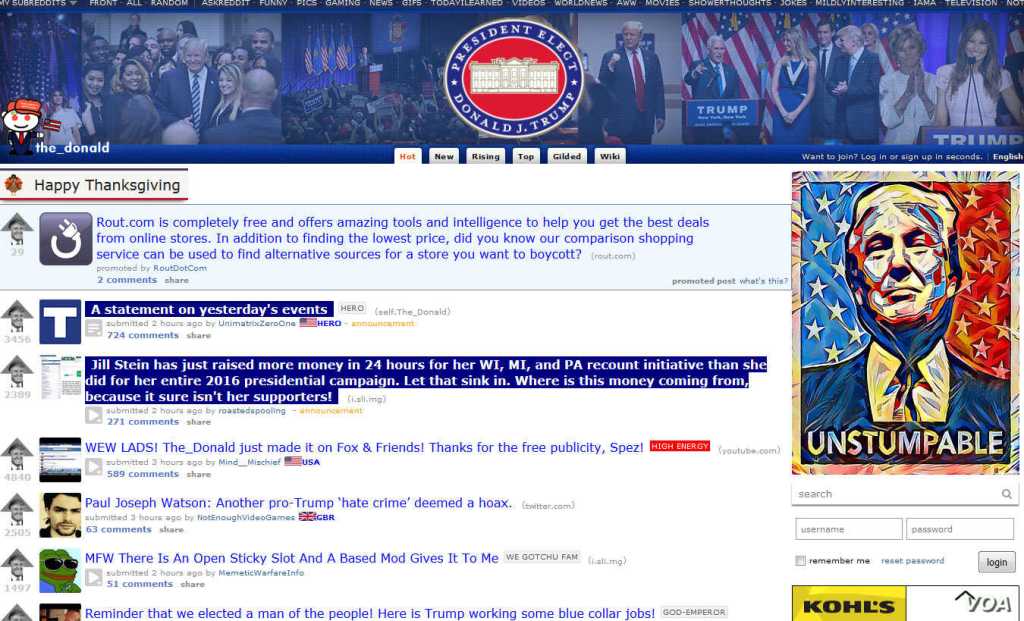 r/The_Donald started out as a community to support Donald Trump leading up to the 2016 US presidential election. Over time, the presence of the subreddit on the site grew enough that it was one of the most popular communities on the whole website and the highest rated post frequently hit the front page. The pro-Trump memes flooded the website through vote inflation and manipulation, and the often racist and xenophobic sentiments of the community could be felt by all users of Reddit. It was not just memes and polling numbers being posted: a few prominent conspiracy theories were discussed here, and some may have even started in this community. One example of a frequently mentioned conspiracy theory was Pizzagate, the theory that high-ranking Democratic Party officials were involved in a child sex-trafficking ring. This theory would go on to pave the way for more recent conspiracies, such as QAnon.
