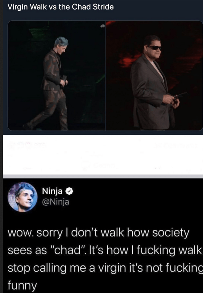 Another great example of this meme which also made its rounds around the inter webs was the comparison between famous streamer Tyler ‘Ninja’ Blevins and Nintendo of America’s previous COO Reggie Fils-Aimé. Short after a videogame expo in which both Blevins and Fils-Aimé went up to the stage, Blevins was compared to Fils-Aimé by way of “The Virgin Walk vs. The Chad Stride” meme. This meme, like many other iterations of the “Virgin vs. Chad” meme template, worked to highlight as well as ridicule the mannerisms displayed by Blevins while going up stage. Features such as facing downwards throughout the duration of his walk as well as his presence online as a streamer with a mainly younger audience were descriptors made to undermine his image in comparison to Fils-Aimé’s perceived confident and cheerful stride while in a similar scenario. This iteration of the meme became so popular that even Blevins’ himself responded to it on a twitter post after many callouts online.