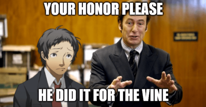 A popular mutation of the Saul Goodman meme has been its combination with other current or well-known memes. For example, “Do it for the Vine” is a phrase referring to the previously popular social media platform Vine, where users could make and post six-second videos. In one meme featuring Saul Goodman, he is shown saying “Your Honor please, he did it for the Vine.” In this case, Saul is claiming that since his client did something for a social media post, he cannot be convicted of a crime.