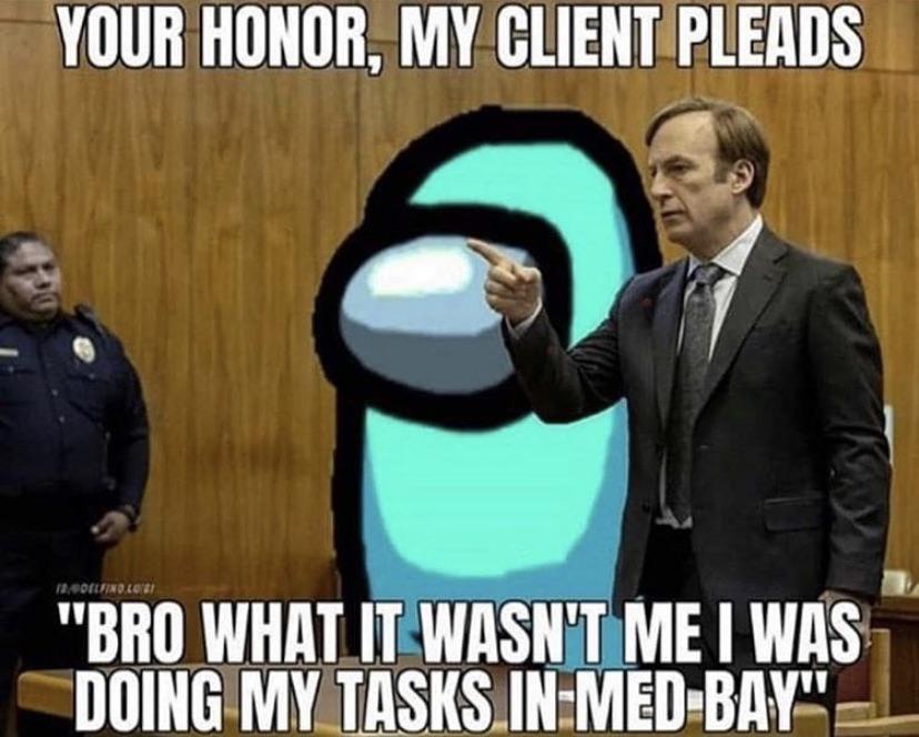 In addition to its combination with other memes, the Saul Goodman meme has been combined with other trending or popular topics. A perfect example of this is with the video game “Among Us,” which has recently generated immense popularity among video game streamers and the general public. In this game, ten people play as “crewmates” of a ship, trying to complete their tasks on the ship before one of the players, the “impostor,” kills them. The goal of the game is to either complete all of your tasks or find out who the impostor is and kick them from the ship by a manner of popular vote. Someone decided to combine this game with the Saul Goodman meme, creating an image where Saul defends an Among Us player who apparently “cannot be the impostor because they were doing their tasks.”