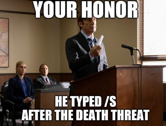 According to knowyourmeme.com, on March 21st 2020, a Reddit user with the username Snaccetti posted the first known “Your Honor” meme featuring Saul Goodman. This version of the meme features Saul Goodman defending someone who apparently sent a death threat, but typed “/s” after the death threat. In the language of the Internet, someone who posts something on social media but types “/s” after their post intends the content to be taken as sarcastic. Thus, according to Saul, his client cannot be guilty since his death threat was supposedly sarcastic. Following this post, the “Your Honor” meme format featuring Saul Goodman gained traction on many different social media platforms, evolving and changing to feature Saul defending his clients for any number of things.