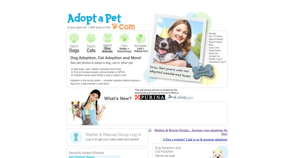 Looking initially at the 2009 version of the Adopt-a-pet.com, as shown above, one would likely not think it to be the same website from 1999. Rather than a wall of hyperlinks and text, the user sees brightly colored graphs and even a picture of Drew Barrymore and her adopted dog Vivian. The most prominent feature of the website’s homepage was its search tool. While the old website left users to search through lists of shelters individually to find animals, the newer website gave users the opportunity to search for pets directly.