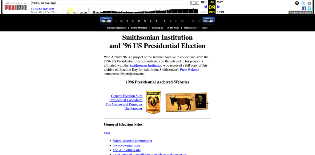 In 1996, the Internet Archive’s simple and clean design reflects that its priority of that particular time was not to immediately create a diverse and organized Internet library for the public but to first establish a reputation and to expose the world to the idea of an Internet library. Different from most databases or archives now, this early web design does not have a search bar or any other category division that allows users to navigate easily and locate useful information. The three columns of texts revolve mainly around the website’s history and foundation story, with the mission statement in the middle. Perhaps due to technological constraints at that time, this design does not have many graphics or icons and uses hyperlinks to direct users to other pages, usually also pages about its history and background. The only information apart from the website’s history itself on this homepage is information about the 1996 U.S. Presidential Election. Therefore, it can be said that there was not much user or consumption experience at this early stage because it was only a beginning, and constructing an Internet library takes time to include and curate information. The adoption of a simplistic design most easily achieves the goal of self-introduction and self-promotion to new visitors and keeps its target audience, people interested in academia, excited for and anticipating future updates.