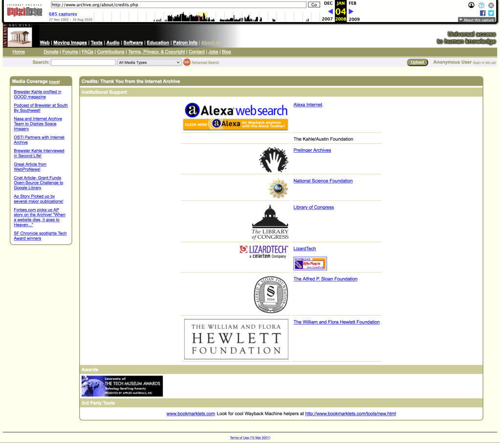 Another key change is that besides acting as a database and search engine, Internet Archive also positions itself as an engaging site for users to casually visit and browse. Apart from offering the search feature, under each category of data, there is a curator’s pick and the newest review. The site welcomes people to use and engage with the site even if they do not have a specific piece of information that they are locating. This new web design makes it a lot easier to casually browse and helps maintain the site’s relevance. At the very bottom, the site also acknowledges the other sources and libraries that it collaborates with, creating this connected virtual community where users can smoothly travel from site to site for different purposes.
