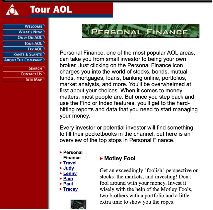 The popularity of the Motley Fool was largely a result of its partnership with AOL in August 1994, which gave them a featured position on the AOL homepage. As a result, by the end of 1995, the Motley Fool had 250,000 visitors a month.