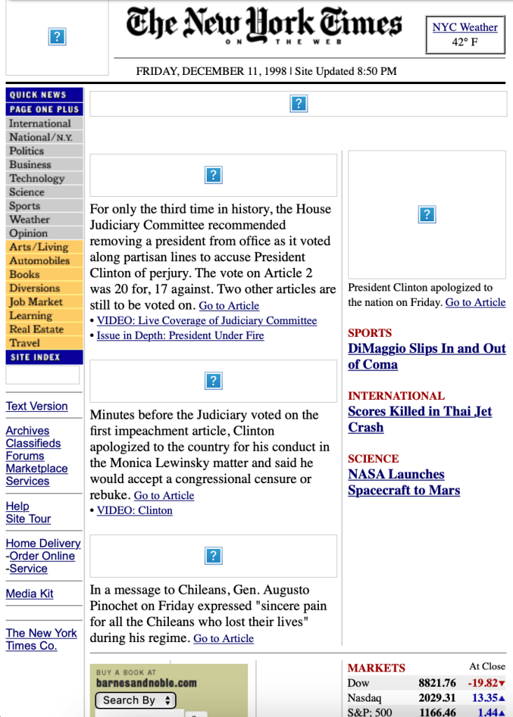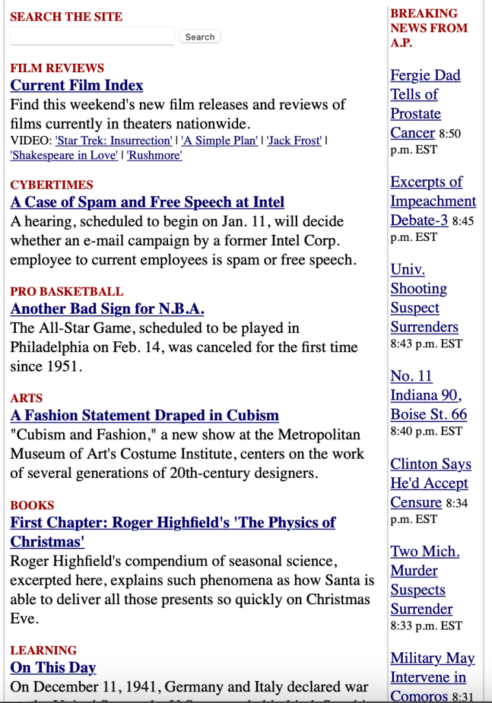 “The New York Times on the Web.” 1998. Web.archive.org. December 12, 1998. https://web.archive.org/web/19981212020124/http://www.nytimes.com/.