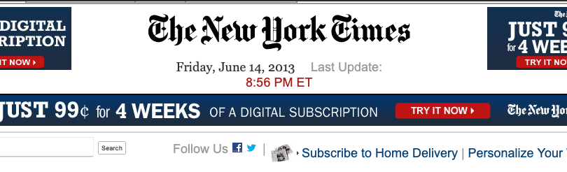 “The New York Times – Breaking News, World News & Multimedia.” 2013. Web.archive.org. June 15, 2013. https://web.archive.org/web/20130615005816/http://www.nytimes.com/.