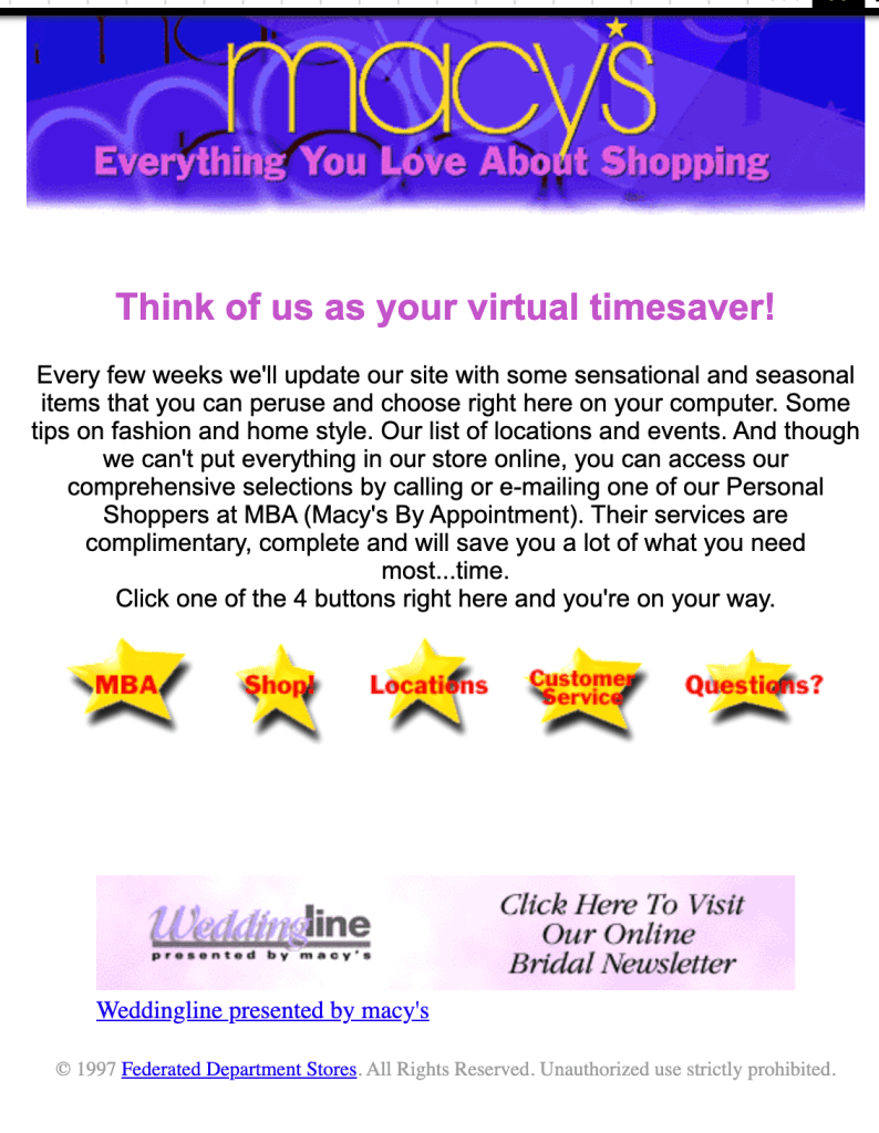 The 1997 version of the Macy’s website was essentially a virtual advertisement of a selection of products curated by Macy’s executives or their marketing department. It also seems like there was no personalization of that curated list for their users, due to the fact that there was no indication of user interactivity in the sense of having users with personalized profiles and the ability to log into the website. Just like much of the rest of the internet at the time, Macy’s.com was more like a list of hyperlinks to more details about the services they provided, as well as store locations you could visit, and a small selection of featured items they were showcasing on the website.