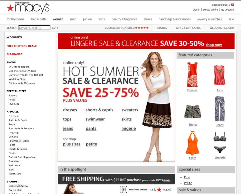 A quick glance at the 2010 version and one can tell that the website is so much more interactive than how it used to be. There is a search feature by keyword, you can browse from categories and sub-categories of products and apparel, and most importantly, there is personalization added through functional elements like a shopping cart and sign-in/accessing account information. There are pictures featuring people dressed in ensembles of clothing looking happy and enjoying life, which can entice people to shop. At the bottom of the screen, users can navigate to bill paying and order tracking. This version of the Macy’s website is truly the 2.0 version due to how interactive it is and how it can completely replace the need to visit an in-person store in order to purchase Macy’s goods.