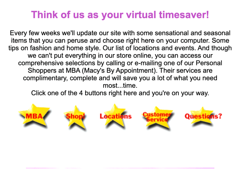 The 1997 version of the Macy’s website was essentially a virtual advertisement of a selection of products curated by Macy’s executives or their marketing department. It also seems like there was no personalization of that curated list for their users, due to the fact that there was no indication of user interactivity in the sense of having users with personalized profiles and the ability to log into the website. Just like much of the rest of the internet at the time, Macy’s.com was more like a list of hyperlinks to more details about the services they provided, as well as store locations you could visit, and a small selection of featured items they were showcasing on the website.