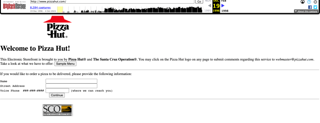 “Welcome to Pizza Hut!” Accessed October 8, 2021. https://web.archive.org/web/19961219205128/http://www.pizzahut.com/.