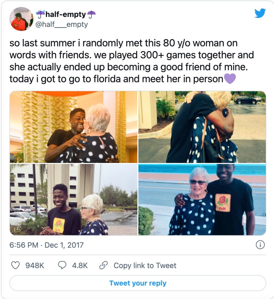 Klein, Allison. 2017a. “A Rapper and an 81-Year-Old Woman just Met in Person After Bonding Over Words with Friends for More than a Year.” The Washington Post, Dec 4,. https://www.washingtonpost.com/news/inspired-life/wp/2017/12/04/a-rapper-and-retiree-bonded-over-words-with-friends-after-more-than-a-year-they-met-in-real-life/.