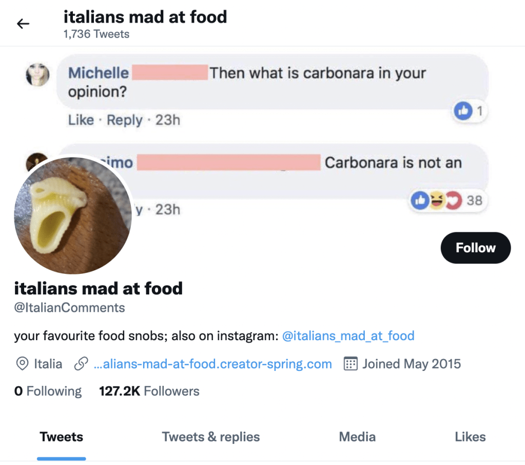 The journey to find the origin of this oddly specific comment leads to a page on every millennial’s second favorite ranting website: Buzzfeed. “23 Italians Who Have Absolutely HAD IT With American Versions Of Their Food” (Emmanuel 2019). Upon scrolling through this article, one can find that it is a compilation of multiple screenshots from every millennial’s first favorite ranting website: Twitter. More specifically, all the tweets featured are from the self-dubbed favorite food snob account @italiancomments. Since May 2015, this account also known as italians mad at food is filled with all sorts of complaints from Italians concerned about the various ways their foods have tried to be prepared. One tweet from May 8, 2019, highlights a time where an Italian was upset because of people’s misuse of pasta. She cites overcooking it, breaking it, and most importantly, the abomination of putting chicken in it (italians mad at food 2019).