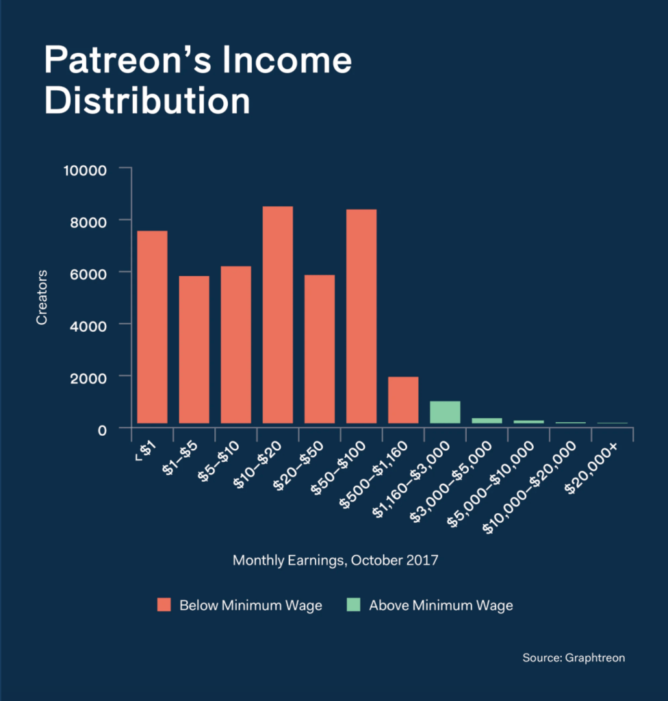 “Finally, ‘starving’ and ‘artist’ no longer need to be joined at the hip,” according to Patreon, in one of its many positive blog posts about its successful creators. But Patreon seems to know that most of its creators are actually making a pittance. In 2016, Patreon boasted that 7,960 users were now making over $100 a month, which struck me as such an insignificant monthly income to brag about. Around the same time, the company reportedly had 25,000 creators, meaning only 31 percent of Patreon’s users were making over a hundred bucks.