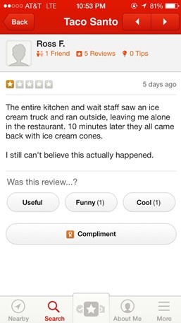 A final point on consumption and production is that Yelp is not immune to the rest of the internet’s nature, sarcasm and humor. Below are a few examples of Yelp reviews you may find enjoyable.