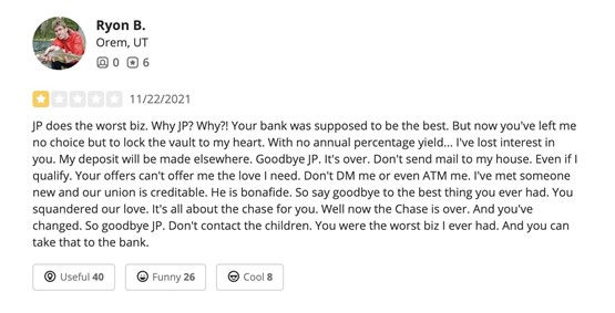 A less dangerous example of a review bomb that Yelp has needed to address was when WallStreetBets Reddit investors went after financial services giant JP Morgan, in defense of their precious leader Elon Musk’s Tesla Inc. Below are some humorous jabs at JP Morgan, the first of which reads like a divorcee letter.