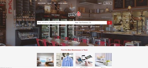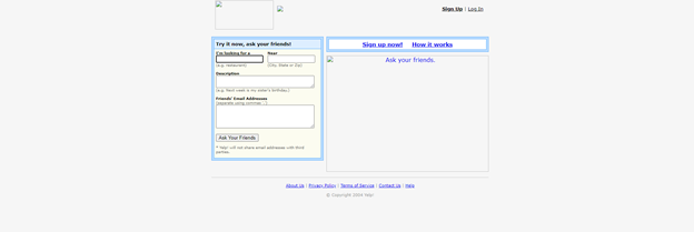 Above is the original Yelp.com website according to waybackmachine.com. It came from humble beginnings as a “glorified e-mail circle”, evident by the above illustration which has inputs for what you are looking for, and your friend’s email addresses. Following this yelp morphed into a question-and-answer style online forum, and then eventually into the traditional review platform we are familiar with today. Throughout all of its transformation Yelp, has kept its representation rather simple. Below we can see a search bar and location on its home page. Two inputs represent quick, convenient information.