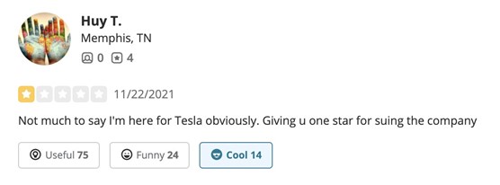 - Jackson, Sarah. “Tesla Fans Flood JPMorgan’s Yelp Page with 1-Star Reviews as Elon Musk Spars with the Bank.” Business Insider. Business Insider, November 23, 2021. https://www.businessinsider.com/elon-musk-tesla-jpmorgan-yelp-one-star-reviews-lawsuit-2021-11.