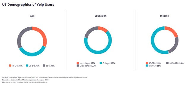 It is evident that Yelp’s outward identity is usually associated with two things, streamlined information, and ranking the most relevant results. However, what is the identity makeup of people that utilize the platform? Fortunately, Yelp publishes this demographic makeup illustrated below.