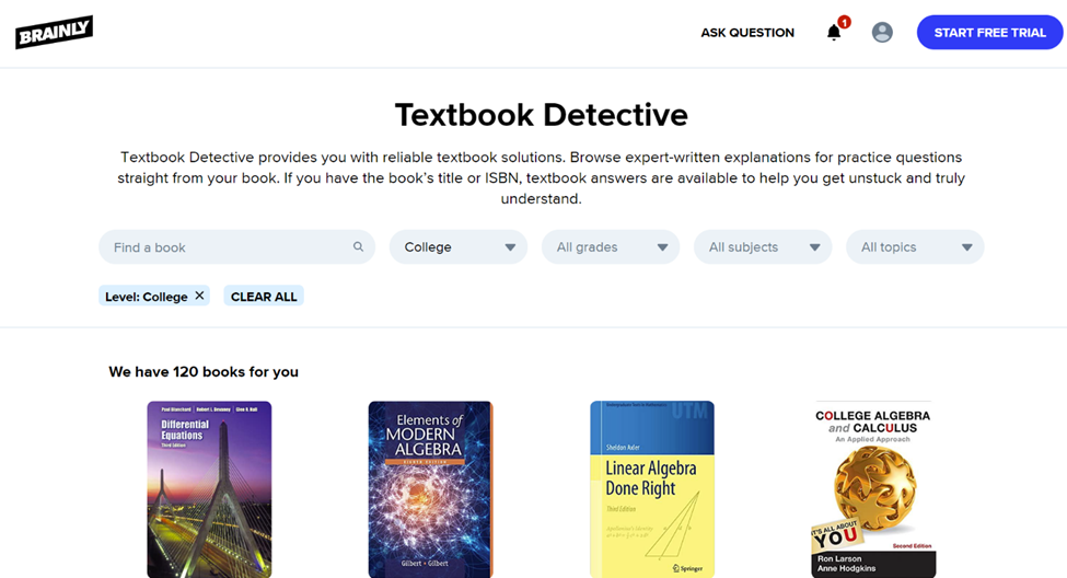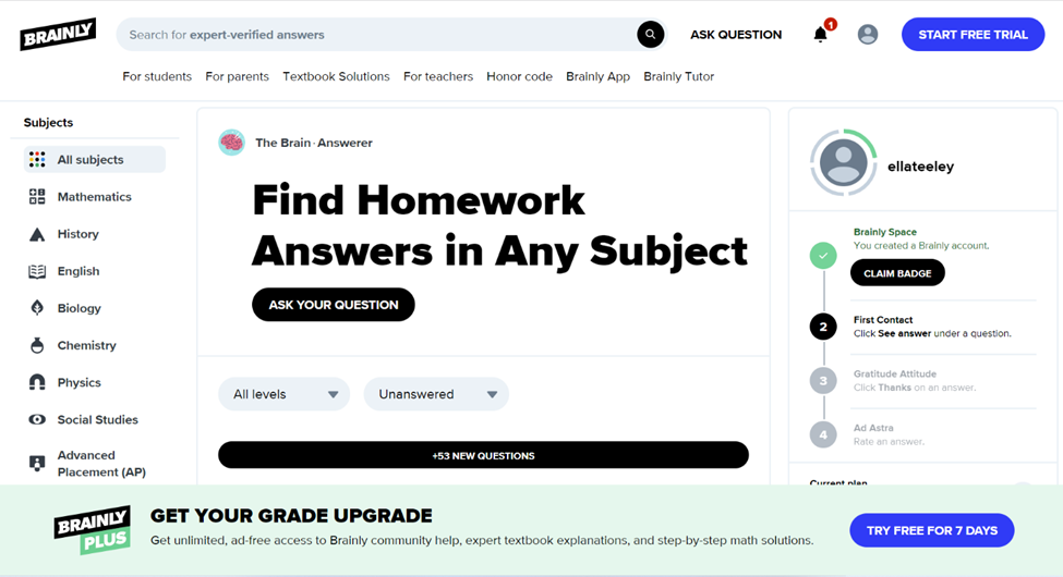 Brain.ly was built to be a homework-helping website. It offers access to textbook answers, “expert” answers, and step-by-step instructions. You can sign up for free with the registration of a login. Users describe whether they are a student or teacher, their email, and their age. The signup for free comes with ads and a limited number of answered questions per day. The payment options are $10 a month for access to verified answers without ads, textbook answers, and access to the math problem solver. The other option is $29 a month for the math and science problem solver, the ability to save answers to view later, and Brainly Plus which includes the Brainly tutor.