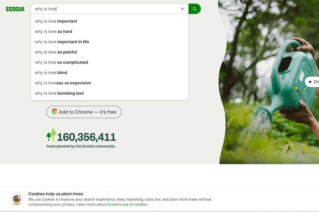 For Ecosia, there is no text blurb, but all of the search results are related to the importance of love.