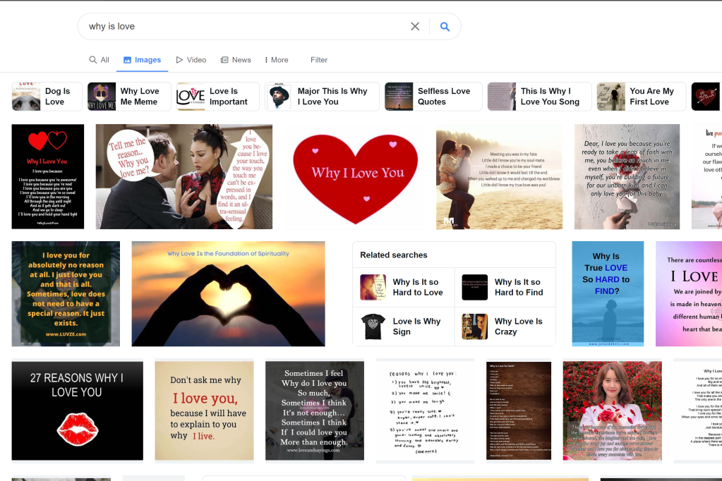 Furthermore, we can see how this search phrase, “why is love,” is represented in the image results tab, and how exactly this relates to the concepts in Safiya Umoja Noble’s Algorithms of Oppression. At the beginning of the book, she talks a lot about how there are certain biases in representation of varying identities like race through the search results. For example, in Chapter 2, Noble states that “Images of White Americans are persistently held up in Google’s images and in its results to reinforce the superiority and mainstream acceptability of Whiteness as the default “good” to which all other are made invisible.” (Noble 2018, 82). Essentially, Noble is arguing that these search algorithms are perpetuating stereotypes about certain groups of people and there is a lack of equal representation in search results. Given that the autosuggestions reflect a pretty pessimistic view on love, but the concept of love itself has an inherently positive connotation, what type of people may be represented in the image results? For Google, the majority of the pictures are just made up of sappy text posts, but we still do see POC representation, albeit toward the bottom of the immediate search results.
