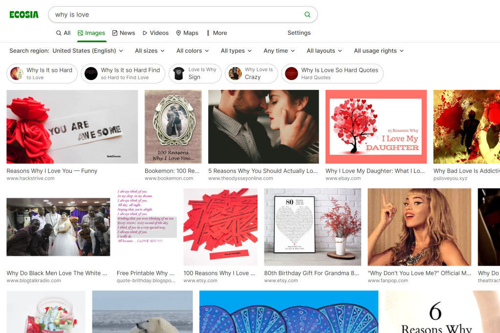 Generally, though, other search suggestions are along the lines of “why is love so hard,” and “why is love so scary,” and this is consistent across all the search engines. I can infer that the searchers may usually be leaning towards that more pessimistic view of love. Unlike the other two, Ecosia is based in Germany, not America. So, the fact that there are such consistent and strong negative feelings about love shows that there are similar values across both American and German cultures about the ever-present disappointing nature of love. These search suggestions about “why love is so painful” do not come out of curiosity. Behind each search suggestion may be a heartbreaking personal experience that seems to be shared among other users of the search engine, no matter the cultural background.