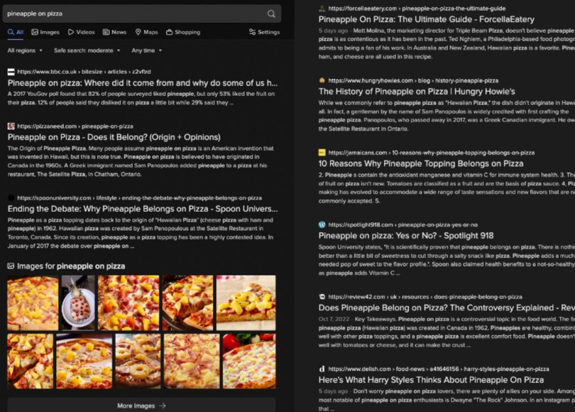 Although looking at autosuggestions is a good way to see how pineapple on pizza is represented by search engines, another way to see this representation is to search “pineapple on pizza” in the search engine itself and look at the first page of results.