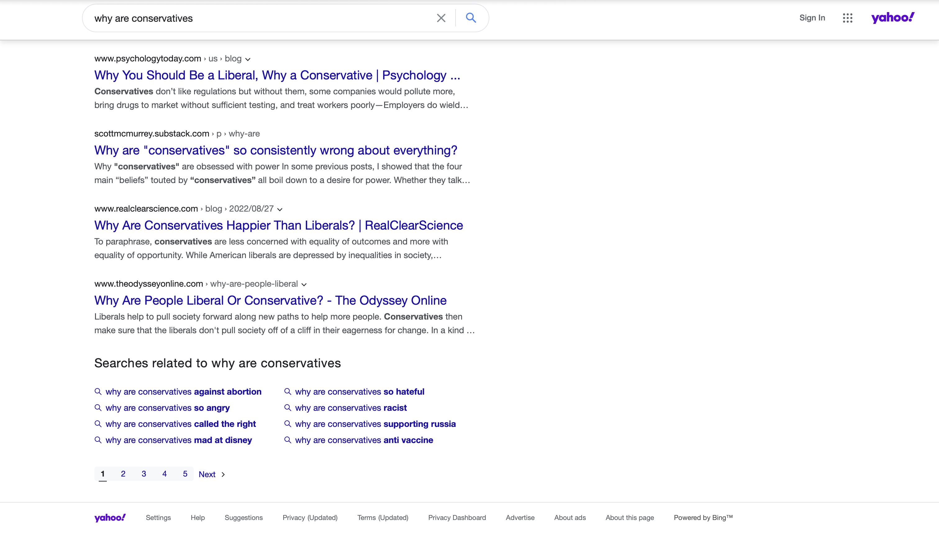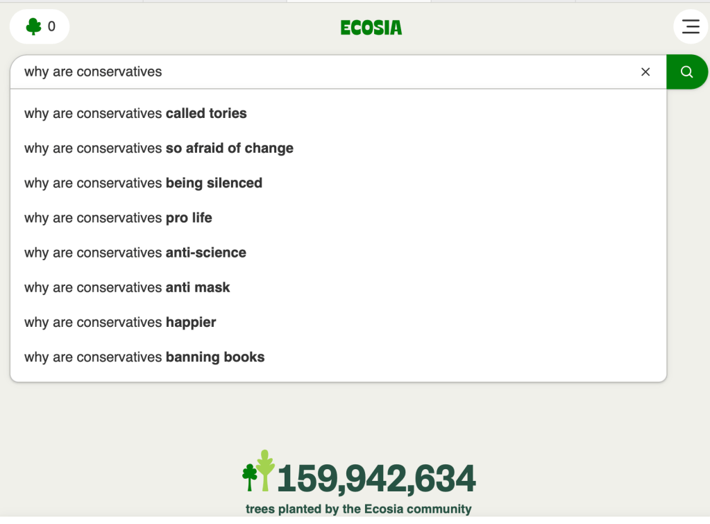 While not the only two political positions, the conflict between conservative and liberal ideologies has been pervasive in online political discourse. It can be very difficult to have a rational discussion without it devolving into name-calling and ad hominem attacks in online political forums. Personally I have certainly been called plenty of variations of “snowflake,” “liberal [derogatory],” “soyboy,” etc. Being aware of the divisiveness of this topic, I wanted to examine how autosuggestions may contribute to reinforcing this division, if at all. I examined the query stem “why are conservatives…” across three search engine platforms: Yahoo!, Bing, and Ecosia. I will note that I intentionally omitted Google, the most popular search engine, from my searches because they actively remove suggestions which could be problematic according to their support page; for this post I wanted to examine search engines that may not regulate their suggestions as tightly. I figured this was a relatively neutral question beginning. However, I would find the autosuggestions to be very divisive and representative of this “us versus them” narrative that is so common in political discourse online.