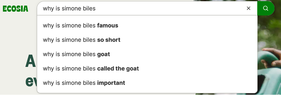 Many search results are the same as Google’s with positive connotations of Biles as “the goat” and calling her a hero. However, Bing and Yahoo contain search suggestions that refer to Biles’ withdrawal and mental health, describing her as “out”, “not competing” and “crying today” in a way that Google failed to. Nonetheless, both engines still paint an overall positive perception of Biles even with their slight acknowledgment of her experience at the 2021 Olympics. Additionally, when using the search engine Ecosia, a German search engine, the autosuggestion results match that of Google, Bing, and Yahoo.