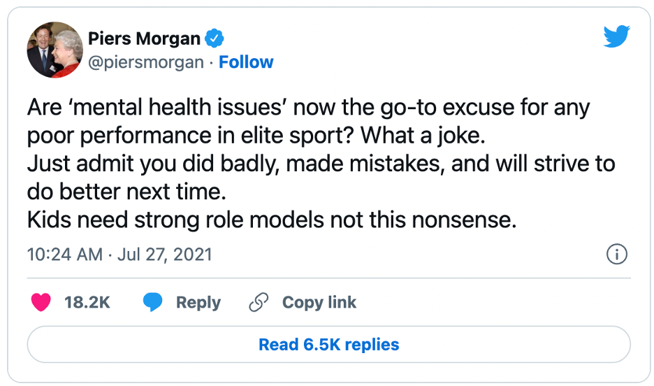 With viral characterizations of Simone Biles as weak, selfish, shameful, and a poor role model, members of the public not only refute the positive Google search suggestions but expose the broader stigma around mental health in modern society. While this entire piece aims to analyze the suggestions of search engines, it is important to acknowledge the negative reactions Biles received, those which, in my opinion, continue to act as obstacles to improving the collective conversation regarding mental health. Without acknowledging these opinions, like those of Morgan, Kirk, and Travis, and how they could potentially hurt Biles or someone who is neither famous nor in the public eye, a true analysis of search engines would fail.