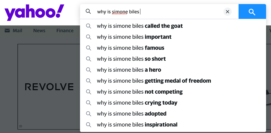 With Google being an American company just as Biles is, it is also important to see how other search engines compare in their suggestions. Upon searching on Bing and Yahoo, 2 other American search engines, many results were like that of Google with only a few differences.