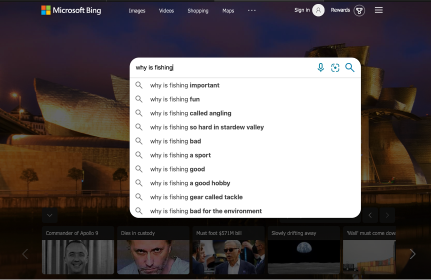I decided to construct my search using Microsoft Bing, Google, and Yahoo by using, why is fishing, as my search term. This search revealed some interesting results that I wasn’t expecting to receive but stayed rather consistent throughout the different search engines. Almost every search engine revealed the exact same results besides for one autosuggestion that differed between the three. Most of the suggested terms were positive and had to deal with why fishing is a fun experience or why it’s good. I believe that due to the amount of people who enjoy fishing and with the general population of people who look up fishing usually are interested in it, the results tended to be more positive. But there are still a few negative search results like why fishing is bad for the environment and why it’s just bad overall, although I believe they included these to appeal to the conservationists and environmentalists of the world. These major search engines need to have some appeals to all different kinds of people who share very different opinions in order for people to have a higher chance of using them. I think Microsoft Bing, Yahoo, and Google all do a very good job of representing the larger population of internet users and cover all their bases very well.