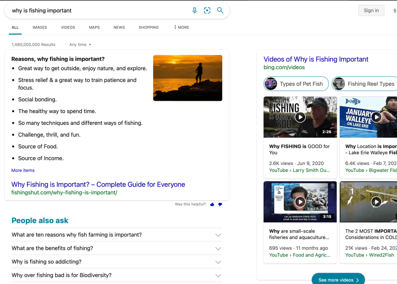 The first result that I received after looking up ‘why is fishing’ was why is fishing important. After clicking on why is fishing important, the search revealed an article, multiple videos, and more search suggestions based on what other people also searched as seen above. I think this is the general layout seen in most searches constructed as it hits all the main points people are looking for when creating a search. This result reflects the topic of fishing in a positive way as it explains how fishing is a great way to relive stress and relax while also providing food and a source of income for some fisherman. It also provides videos from YouTube of people fishing and explaining the techniques they are using as well as what they are catching to entice others to fish. Most of the language and tone exercised by the articles and videos from the results, give off a positive and happy aura to make others wish they were fishing or want to go. Another interesting layout feature was that there was only one negative comment on the search results which was why overfishing was bad for biodiversity. Besides for this one comment, every other term, video, or picture represented fishing in a positive way.