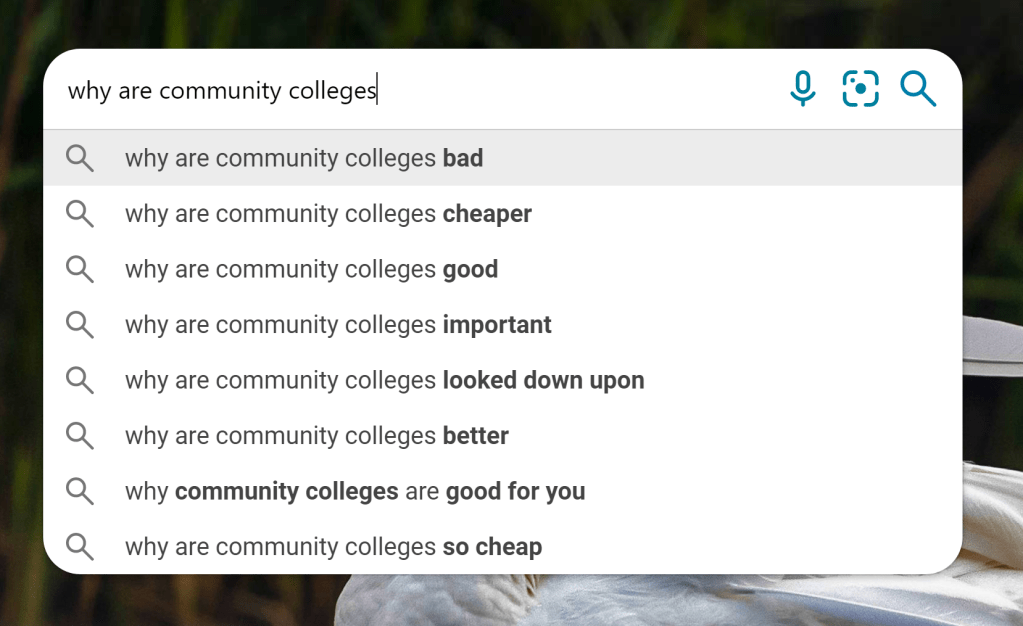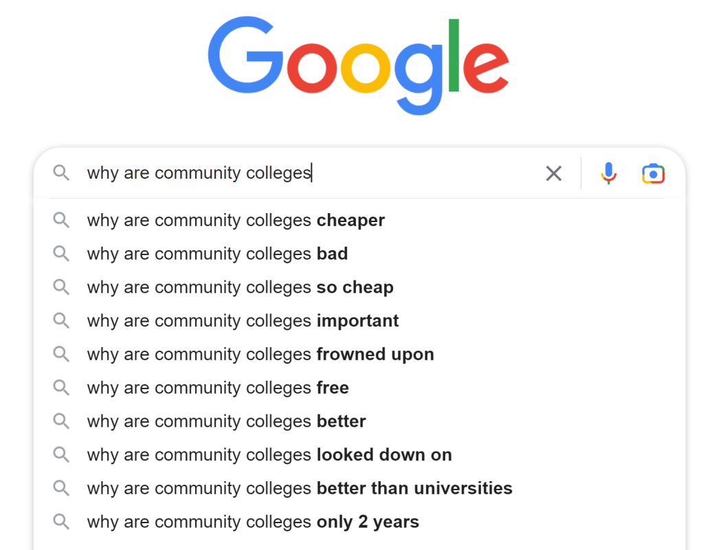 And yet a decision must be made, and the first step is often the same: Looking up whether community colleges are a desirable choice. And yet, before your questions are completely typed, Google will have given you the following autosuggestions: