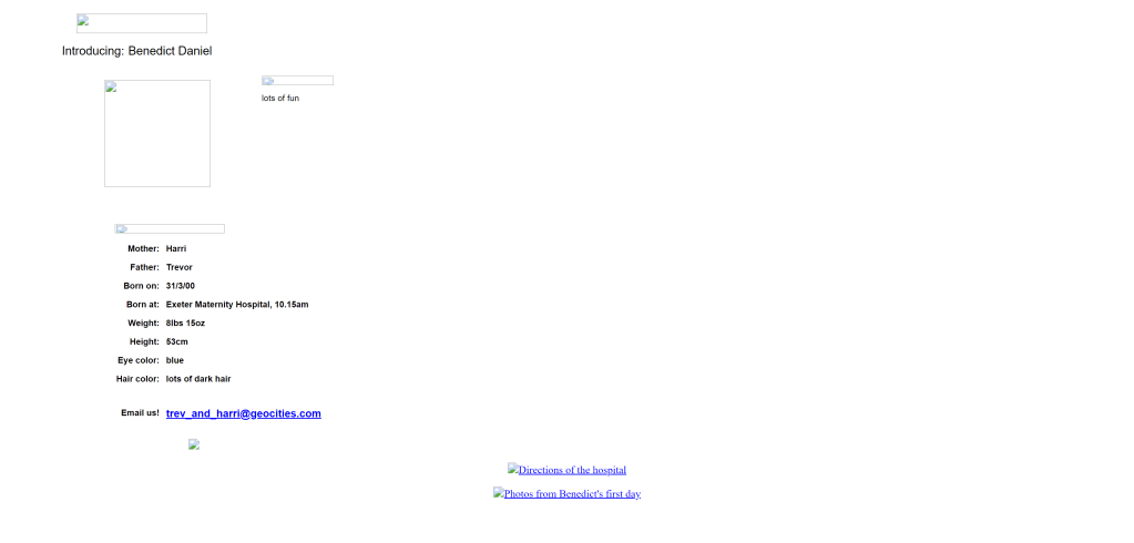 The background is covered with the same repeated pictures of their baby. If you click on the link “Baby has arrived!!!!!” You are taken to a page that lists the details of when and where baby Benedict Daniel was born and other extremely detailed physical features, including the precise weight.