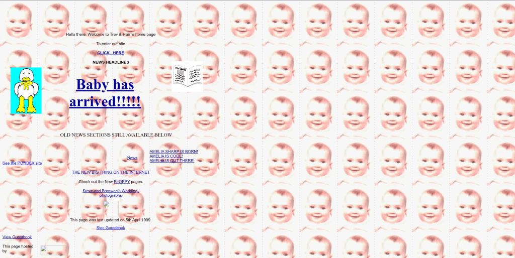 At some point in time when friends marry and settle down, the never-ending abundance of baby photos find a permanent home in our Instagram timelines. However, as annoying as that may be, at least it wouldn’t be multiple pages of a whole website dedicated to the birth of a baby; but, that’s exactly what Trev and Harri did in 1998 in their website on GeoCities. In this essay, I will be analyzing Trev and Harri’s webpage in the GeoCity platform and how the production of exploiting their private information online translates into an assimilation of the audience into Trev and Harri’s personal identity.