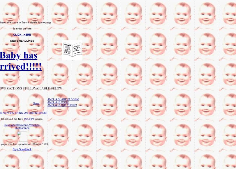 Furthermore, the textual information that the viewer notices when they click onto Trev and Harri’s webpage are the large words “Baby has arrived!!!!!”