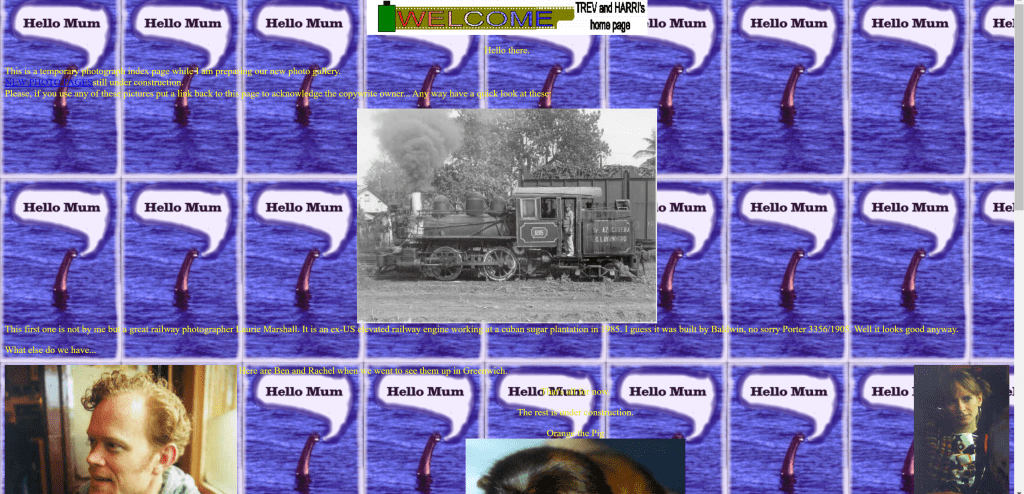Even the pictures presented, one of a railway engine and others of self-portraits, don’t have any clear linkage between them, again giving into the amateur, yet individualistic aura of the webpage. They haven’t taken stylistic choices into account, so they seem to be more focused on the personal content they post, rather than the way they post it. In essence, Trev and Harri seem to be trying to cultivate a very singular and individual identity of their website through their quirky, mismatched graphics and their energy behind their big fonts. The other content they present are just as jumbled as their graphics; they even have separate links just dedicated to their duck and photographs of someone else’s wedding. Again, they present certain parts of their page to try to grab the viewer’s attention, through things like the big fonts and bright colors, but they want the audience to become invested in their own personal interests and specific content they post.