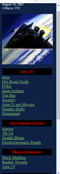The site is separated into three sections: Area 51, Government Secrets, and Places of Interest. This conveys how users of this site are interested in the evidence behind the conspiracy of Area 51 and do not believe the government is telling the truth. Users can range from those who are obsessed with the topic and have their own Area 51 experiences to those who are simply curious or have heard about the idea in the media. There are sections in which the web master talks about his own experiences at the base demonstrating he is closer to the obsession side of the scale. The qualitative data is very thorough, but the arguments are biased and one-sided. I think the web creator benefits from this website because he simply enjoys talking about it and this way he can share his interests and have a platform to talk to others who have questions.